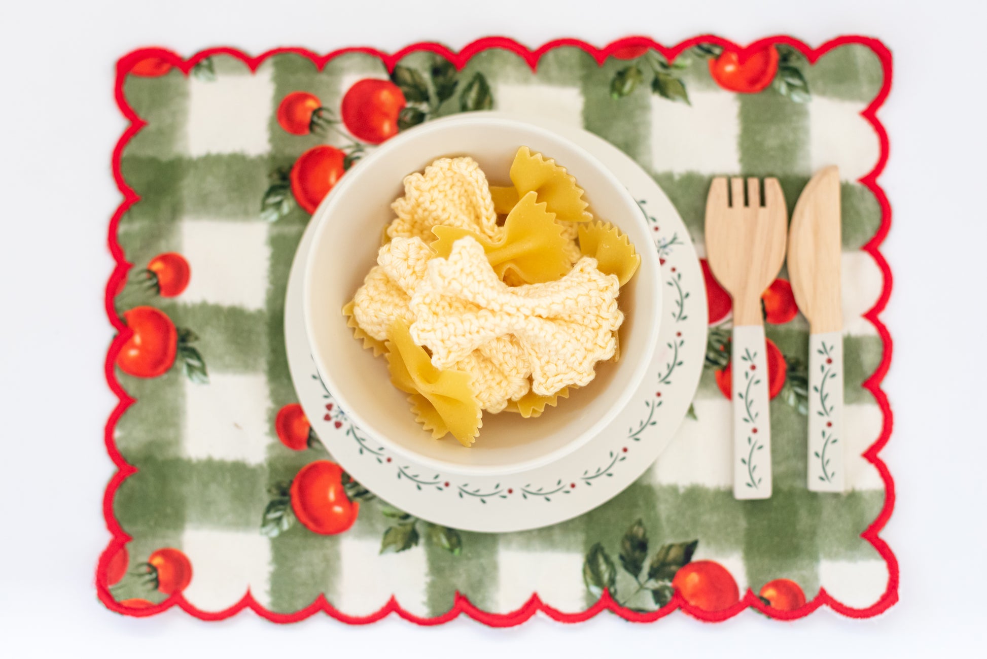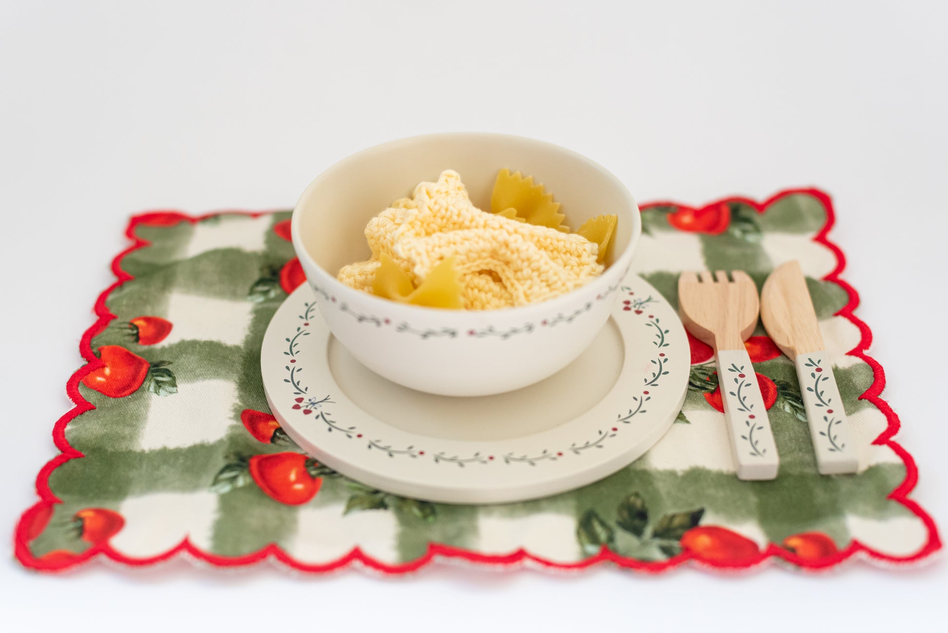 Obs: Talheres, prato, bowl e macarrão em crochê não inclusos